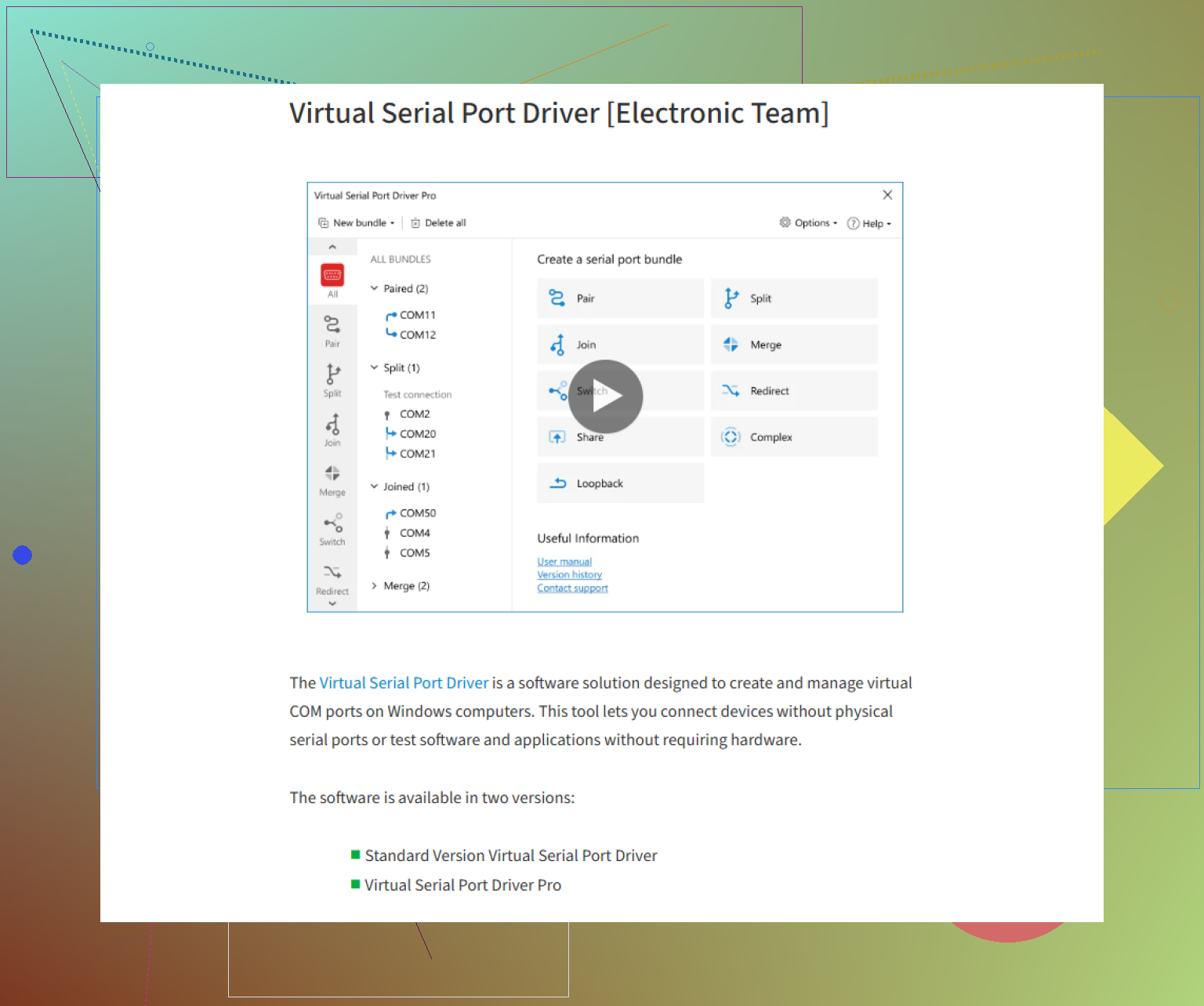 Another under-the-radar, but REALLY handy tool: “Null-modem emulator (com0com-like)” by Eterlogic. It’s called “VSPE” (Virtual Serial Ports Emulator). Kind of a power user’s tool—more control, but def not as click-and-go as Virtual Serial Port Driver. The free version limits you to 1 pair, but for testing or dev, it might be enough.