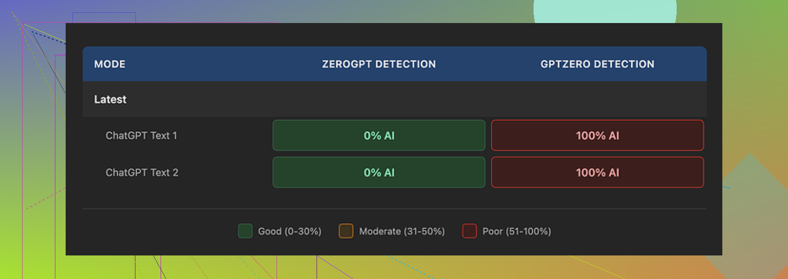 • Detection scores were better on the same tools, including GPTZero.