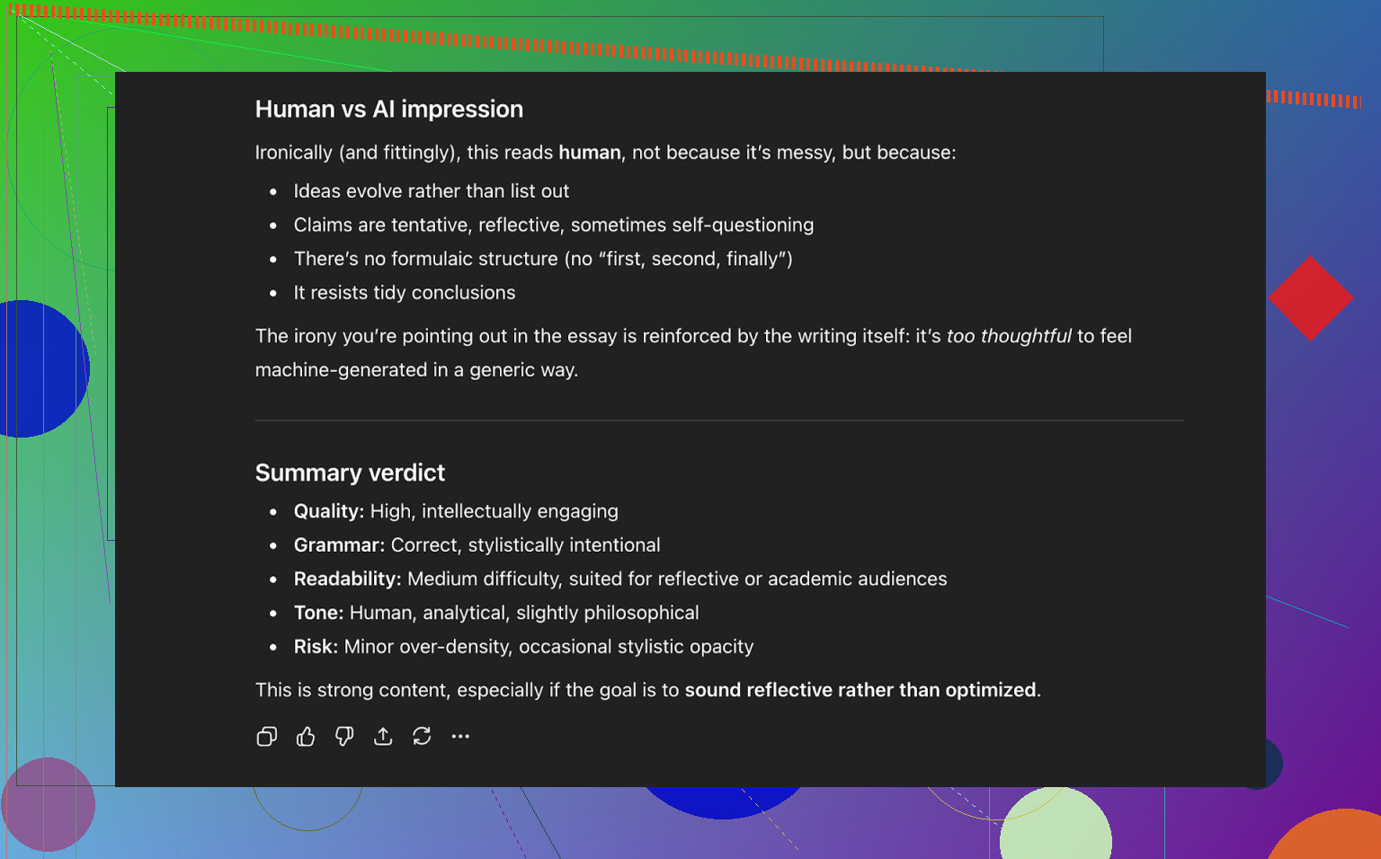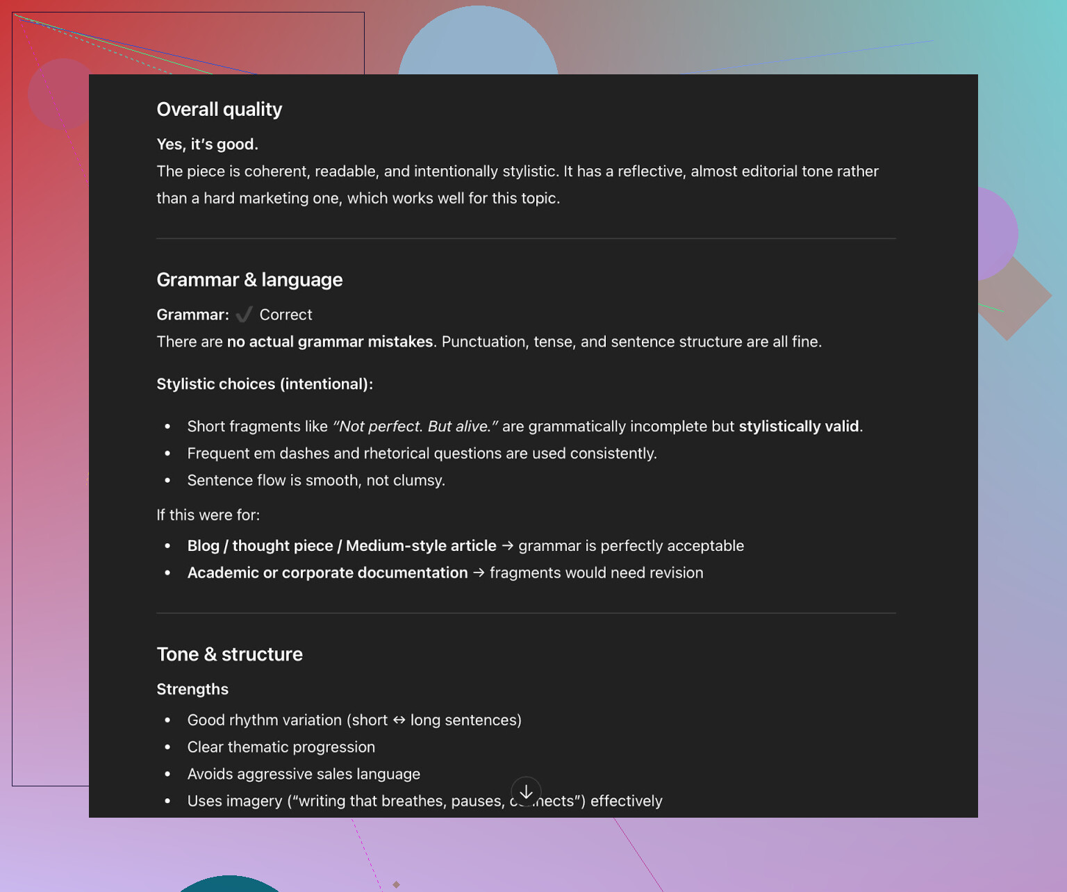- Zelfs met 0% AI-scores voelen sommige stukken nog steeds “machine-vormig” in structuur en ritme.