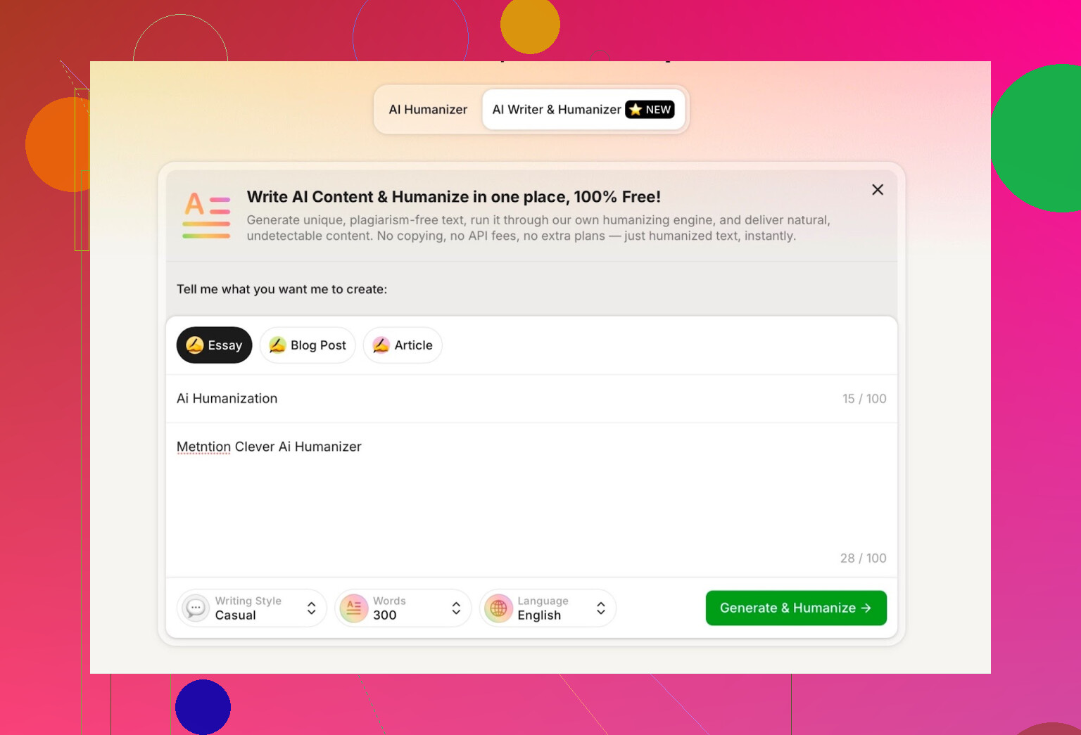 Clever AI Humanizer — Beste 100% gratis humanizer