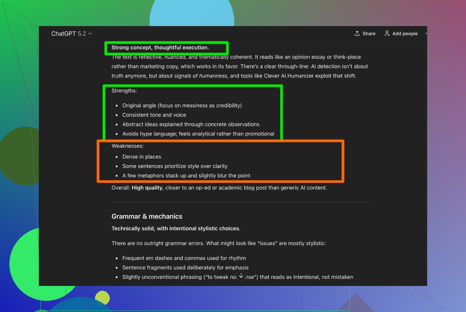 Ik heb de Clever AI Humanizer-output aan ChatGPT 5.2 voorgelegd met de vraag om analyse: