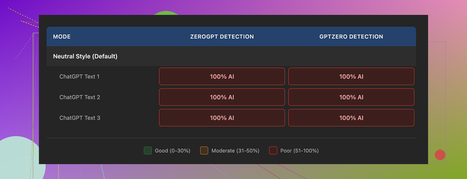 Detectors punish that style hard. So even with polished output, the tools reading it still screamed “AI” at 100%.